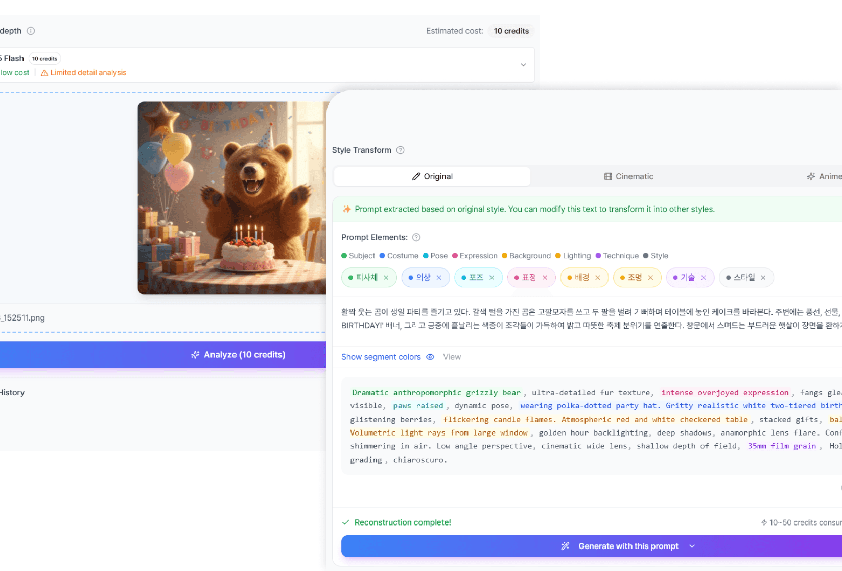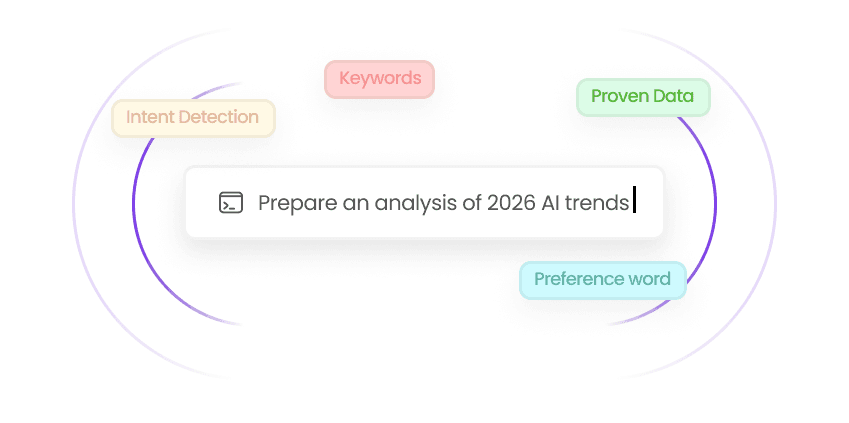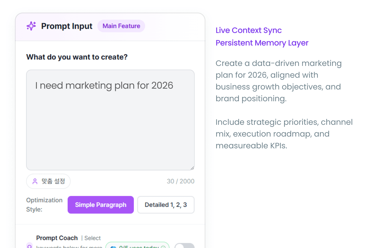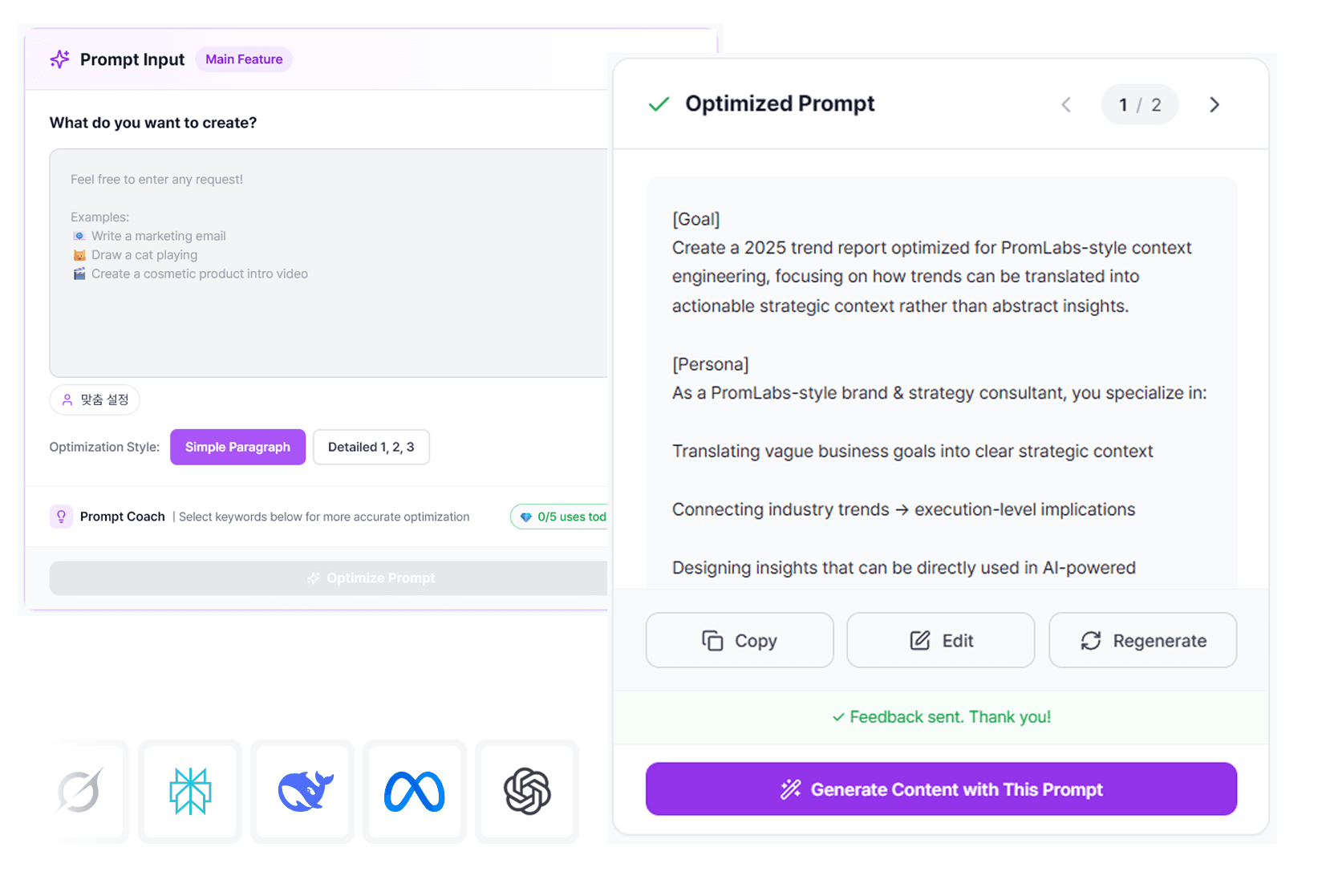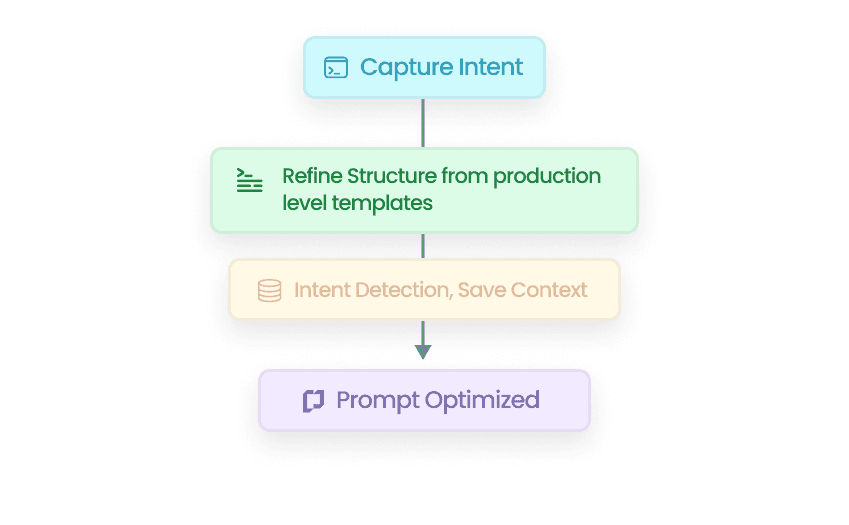 입력과 동시에 프롬프트를 교정·정제·최적화하여, 아이디어를 즉시 실행 가능한 의도로 전환합니다.